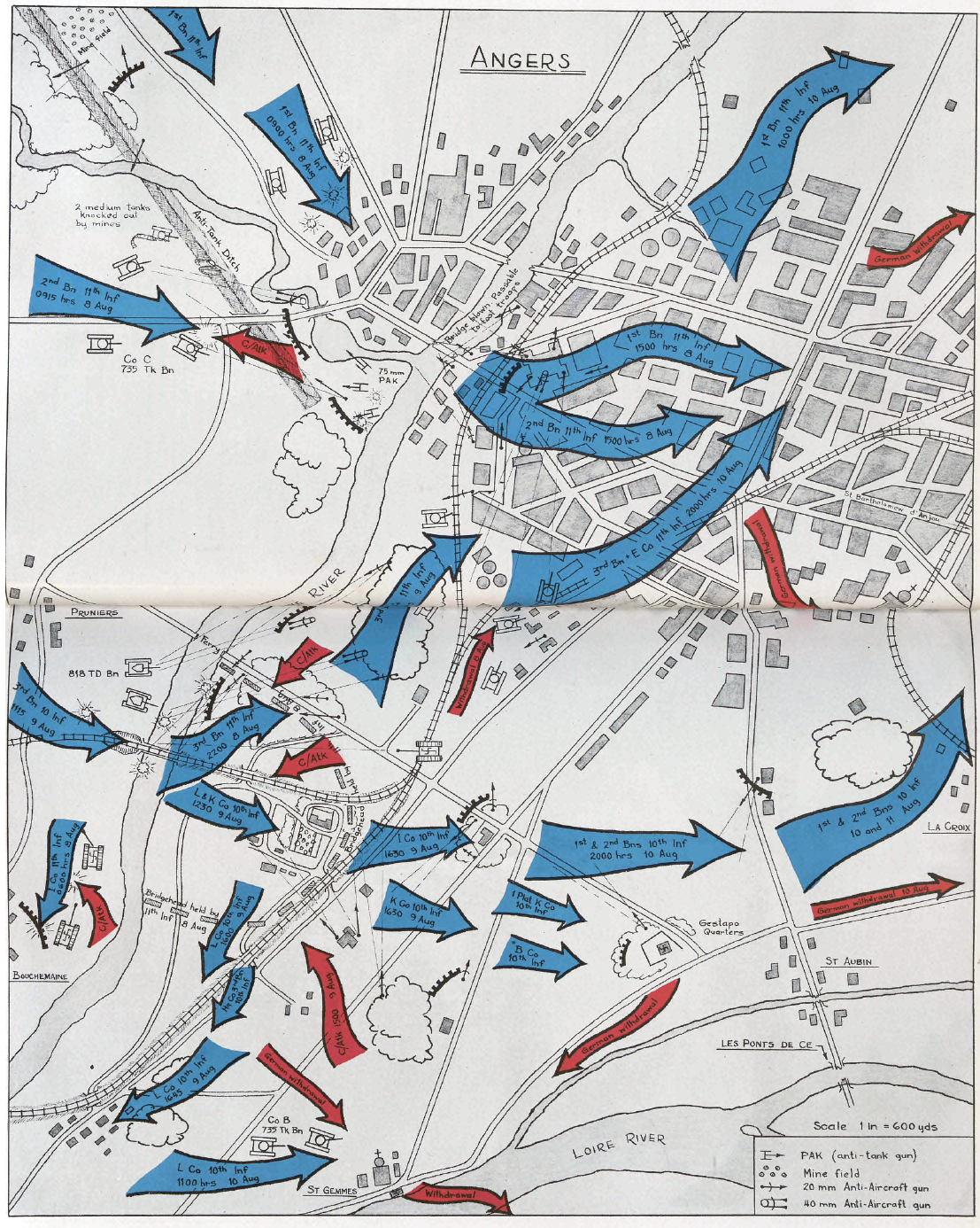 Les premiers bataillons du 11th Infantry Regiment sont arrivés aux abords de la ville d’Angers au petit matin du 8 août. Ils ont été suivis dans leur avancée par le 10th Infantry Regiment.