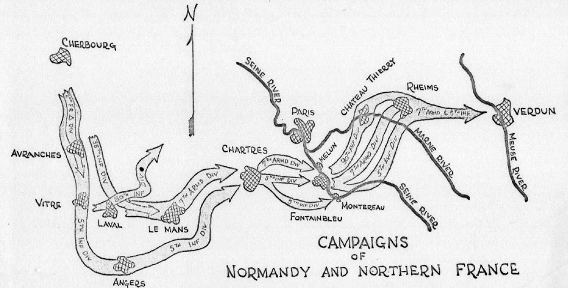 Lors de la percée vers Le Mans : L e 537th AAA AW Battalion et le 344th FA Battalion avancent en parallèle avec le XXème Corps. L’officier de liaison A.A.A. aurait été chargé de positionner les batteries autour de points sensibles comme Domalain, Bais, ou les carrefours routiers. Il aurait aussi coordonné les tirs contre les Fw 190 et Me 109 qui survolaient les colonnes.