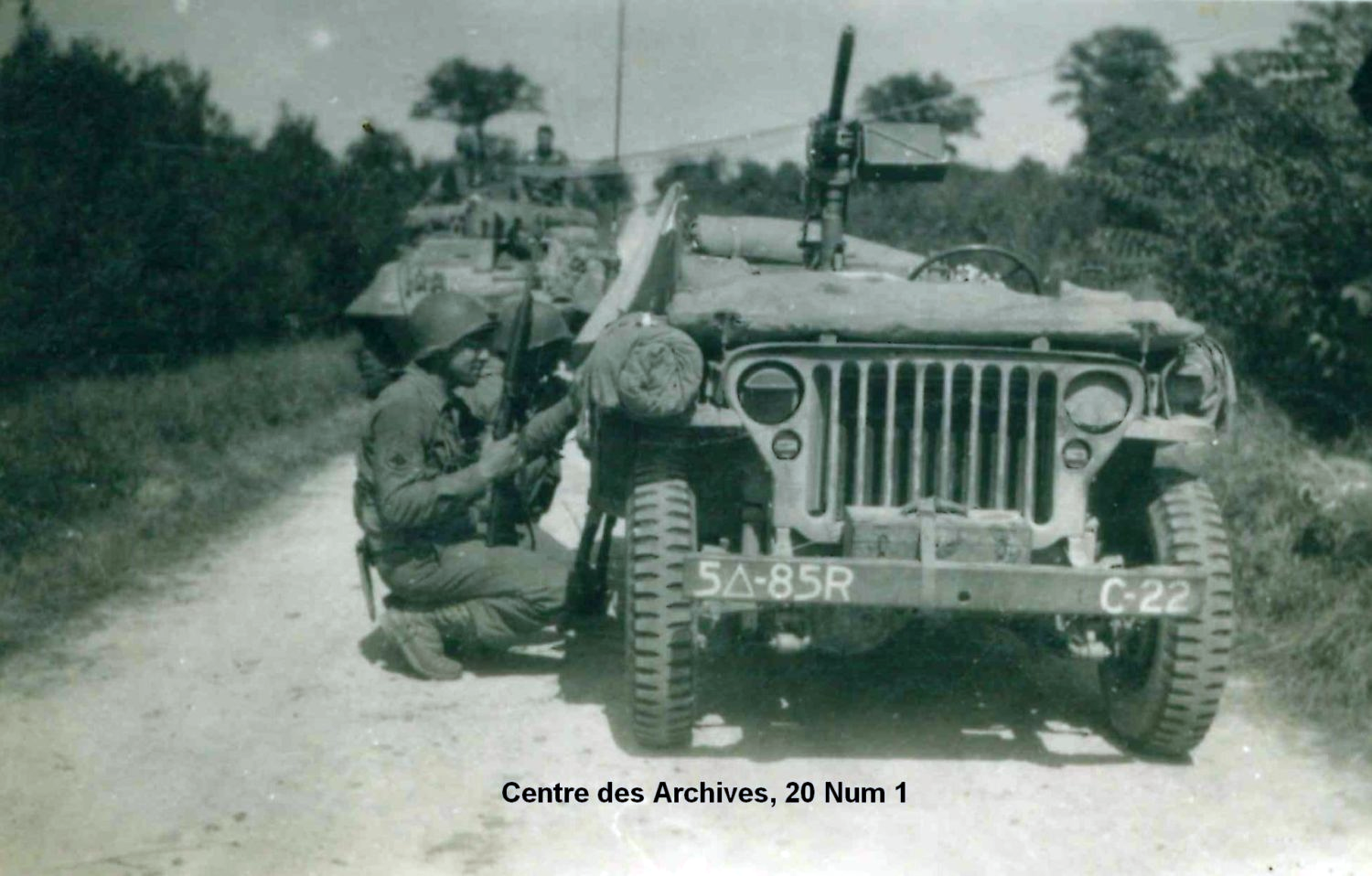 1) Colonnes de combat allégées : Batterie d’E.M., le Commandant, et Capitaine CHANSON, le Lieutenant MESTDAG, le Lieutenant MESSIAH et le Lieutenant BREZTNA dans un Command Car, une Jeep, un 750 kg (5-13).