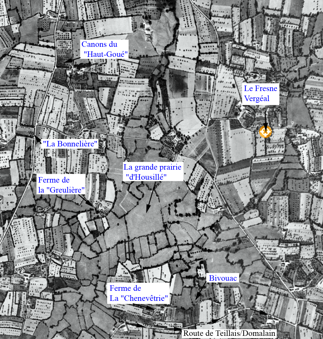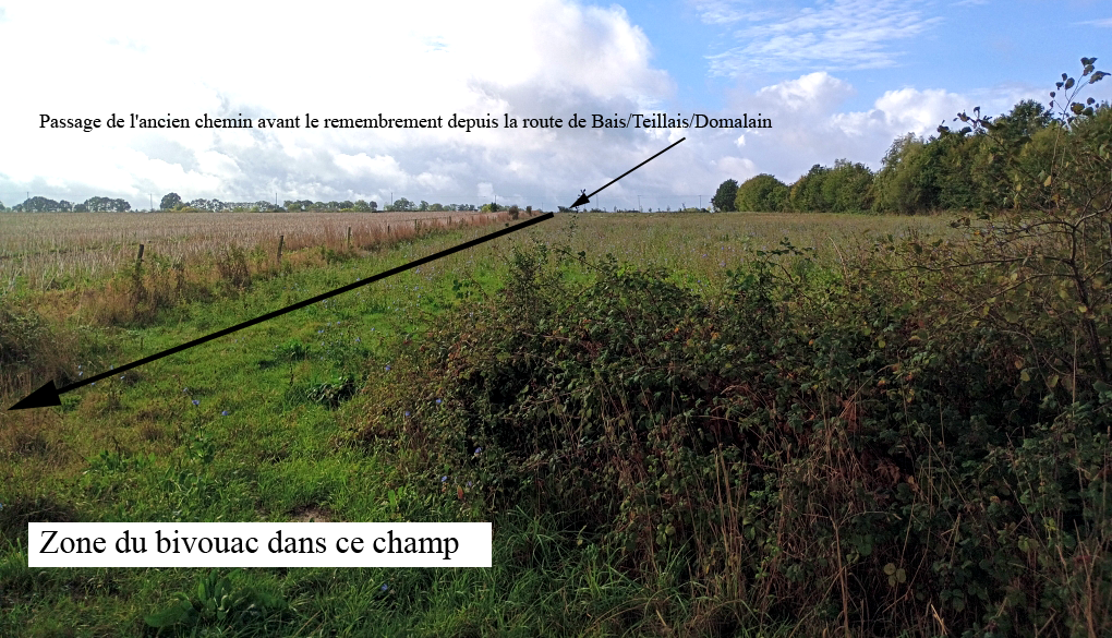 Selon la section du Teillais-C1, les anciennes parcelles ayant été le bivouac américain serait la parcelle, n°238 « La feronnerie », il y avait ce chemin de terre qui partait de la route de Teillais/Domalain, situé à 250 mt de la dites route. Un bivouac bien caché derrière la haie. Haie qui se trouve toujours à la même place en 2025. Voir la photo aérienne de 1950.