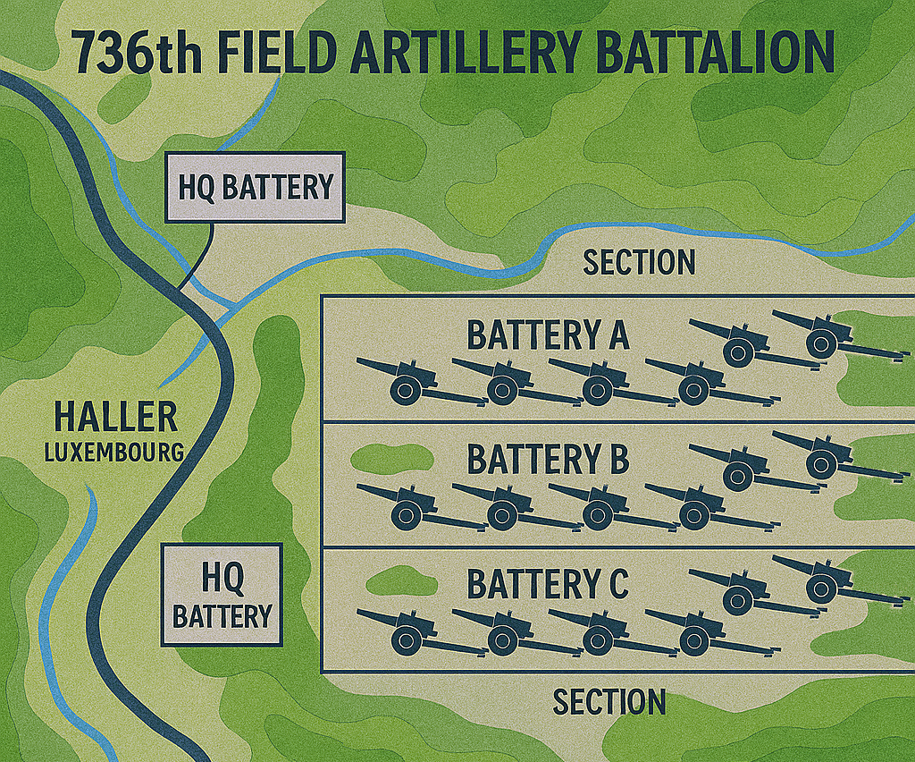 Chaque batterie (A, B, C, D) était divisée en plusieurs sections (ex. B1, B2, B3…), chacune avec ses propres véhicules et équipes de tir.
