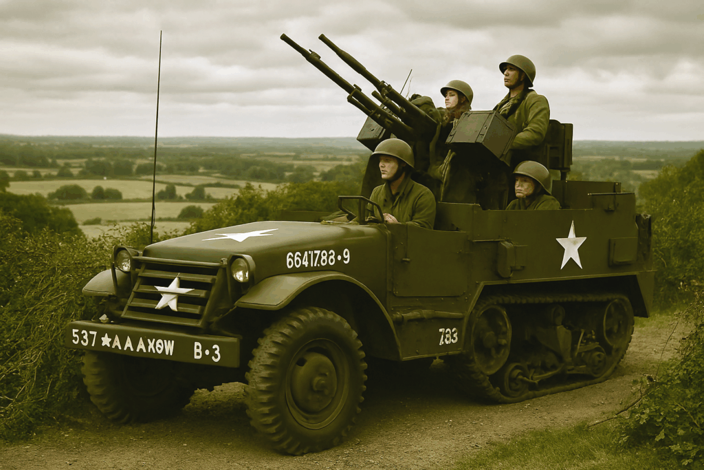 Une batterie du 537th AAA AW Battalion en position au nord de Domalain, le 7 août 1944. On y voit le M16 MGMC camouflé sous les feuillages, le Quadmount .50 cal braqué vers le ciel, les soldats en alerte. Image générée par IA via Microsoft Copilot.