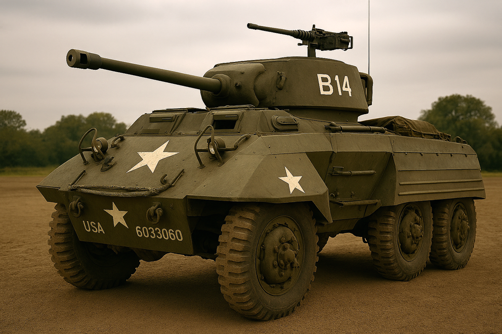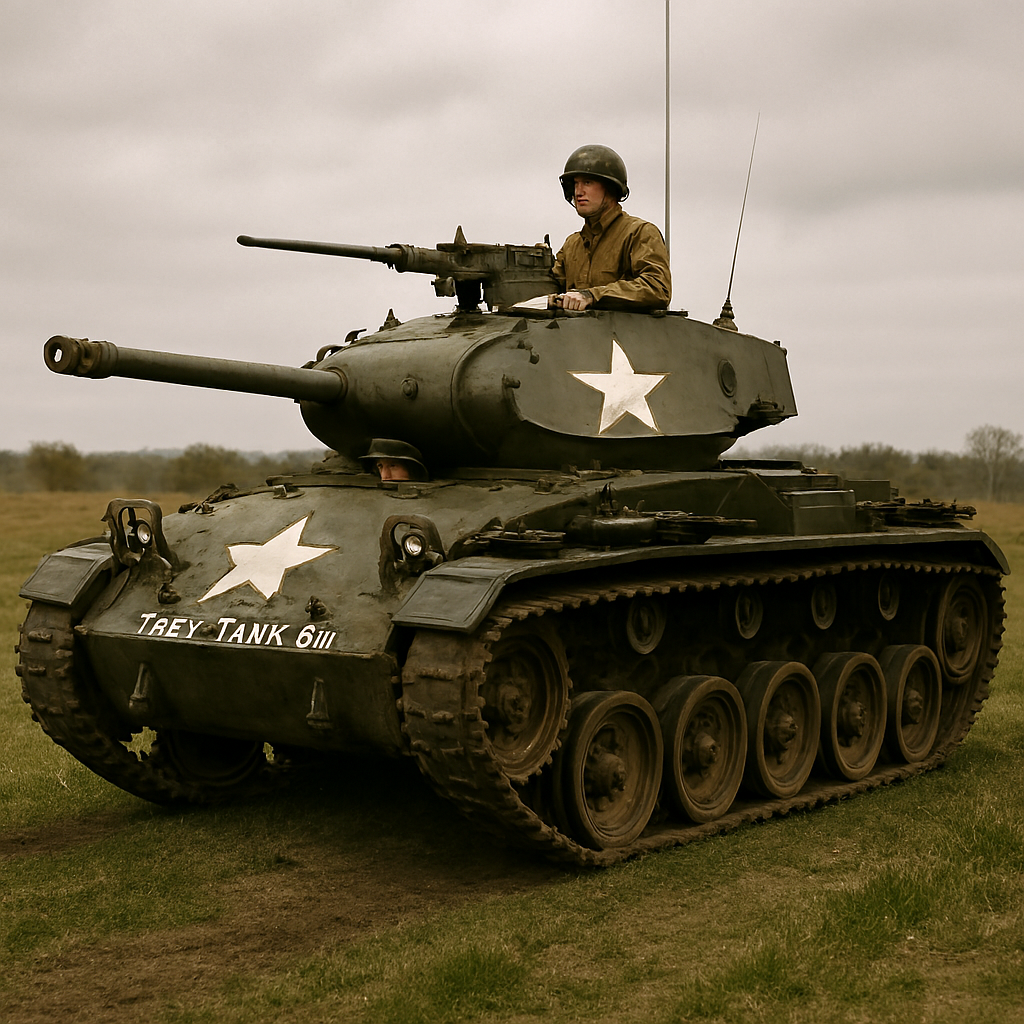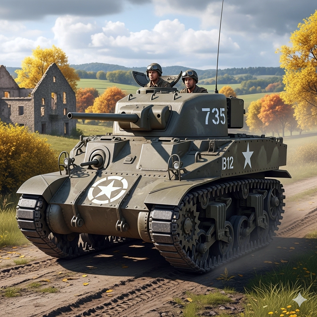 Un M5 Stuart du 735th Tank Battalion. Image générée par IA via Microsoft Copilot.