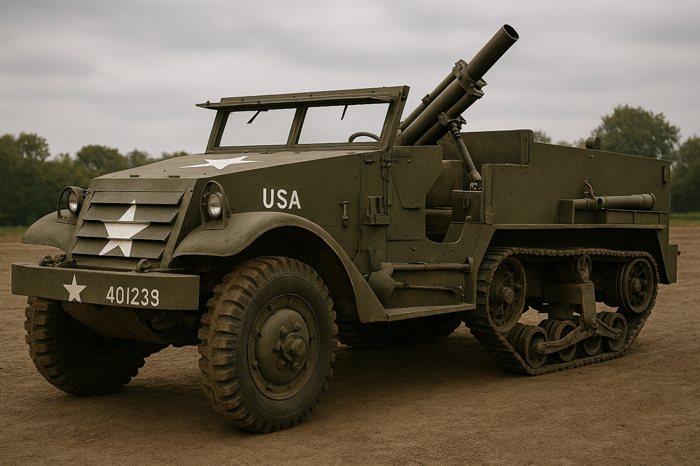 Un M21 Half-track Mortar Carrier, mortier de 81 mm M1. Image générée par IA via Microsoft Copilot.
