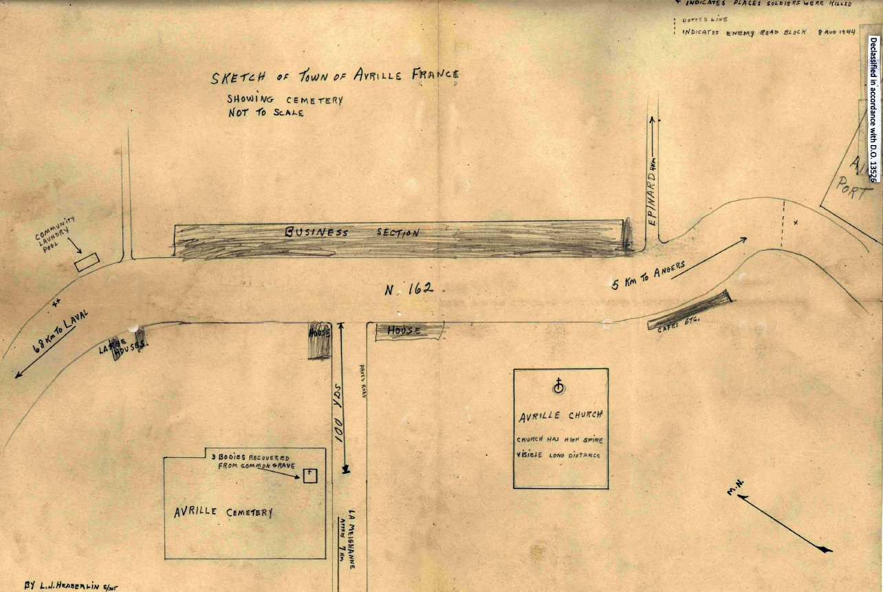 Le 10 août 1944, après l’évacuation de la ville d’Avrillé par l’ennemi, je me suis rendu sur les lieux de l’affrontement. J’ai contacté des civils et j’ai été conduit au cimetière local, où ils m’ont dit avoir enterré trois soldats américains. Les Français avaient enterré deux hommes dans une fosse le 8 et y avaient placé leurs deux casques. L’un portait le nom de Smartt et l’autre celui d’Anderson. Les Français m’ont raconté qu’après l’extinction des flammes dans le véhicule blindé, ils s’y étaient rendus, avaient retiré un corps (probablement celui de Klug) et l’avaient enterré dans la deuxième fosse le 10 août. Les plaques d’identification de Klug m’ont été remises et elles avaient clairement été brûlées. D’après le récit des Français, il semble que l’homme resté dans le semi-chenillé, le sergent Jesse Rice, ait été enlevé par les Allemands lors de l’enlèvement des véhicules. Toutes les informations ont été placées dans des enveloppes imperméables et fixées aux stèles funéraires. Tous les papiers d’identité (étiquettes, etc.) avaient été retirés des corps par les Allemands avant leur inhumation par les Français.