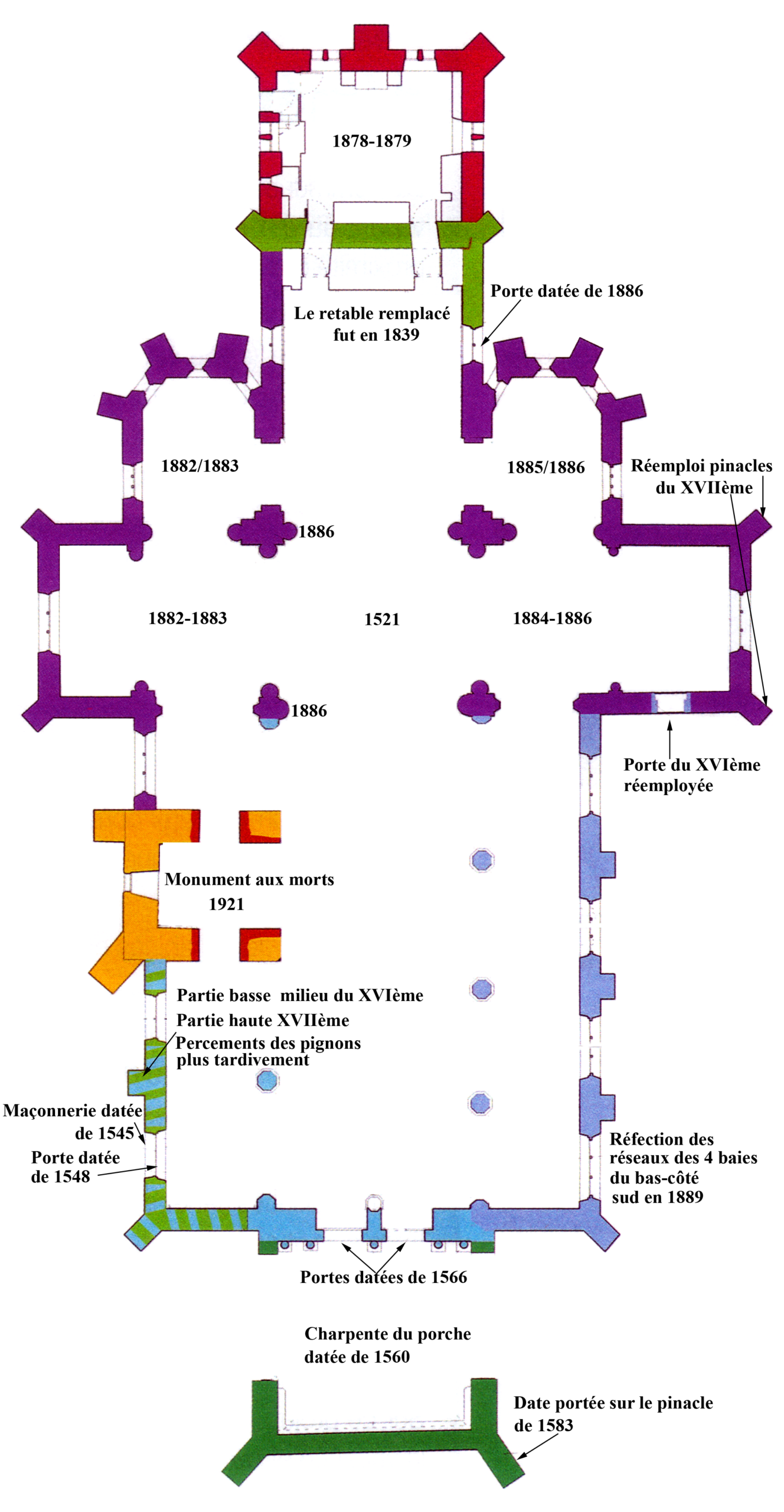 Si nous reprenons le plan, avec le tableau des couleur, nous y voyons différentes étapes dans la constructions de l’église ou du moins, sa restructuration à partir du XVème siècle. La partie du clocher serait la partie la plus ancienne. Et ensuite la partie du coté de la porte au nord Saint-Marc.